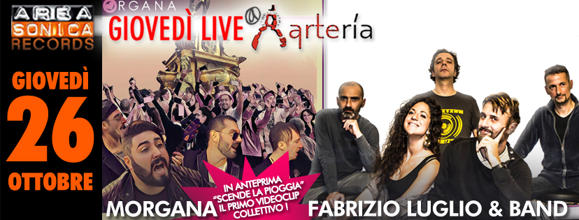 Dopo il successo della prima serata lo scorso 12 ottobre, prosegue il prossimo giovedì 26 ottobre la rassegna di musica live firmata Areasonica Records in collaborazione con Arterìa! Sul palco ci saranno Fabrizio Luglio e la sua Band e i Morgana, grande musica live e una sorpresa: la presentazione in anteprima assoluta del primo...